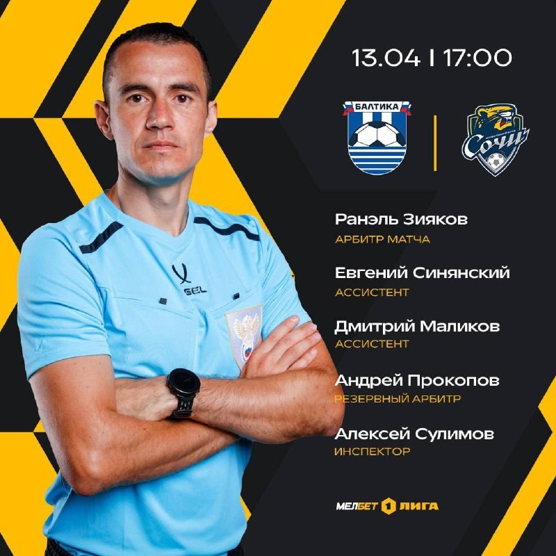 На матч «Балтика» ⚔️ «Сочи» назначена следующая бригада арбитров: 🚩 Главный арбитр матча — Ранэль Зияков 🏳 Ассистенты судьи — Евгений Синянский, Дмитрий Маликов 🔄 Резервный арбитр — Андрей Прокопов 👀 Инспектор — Алексей Сулимов В качестве главного судьи Ранэль Вякилевич работал на четырех матчах «Балтики», в которых наша команда трижды одержала победу и один раз уступила. В этих встречах в сумме было показано четыре желтые карточки.