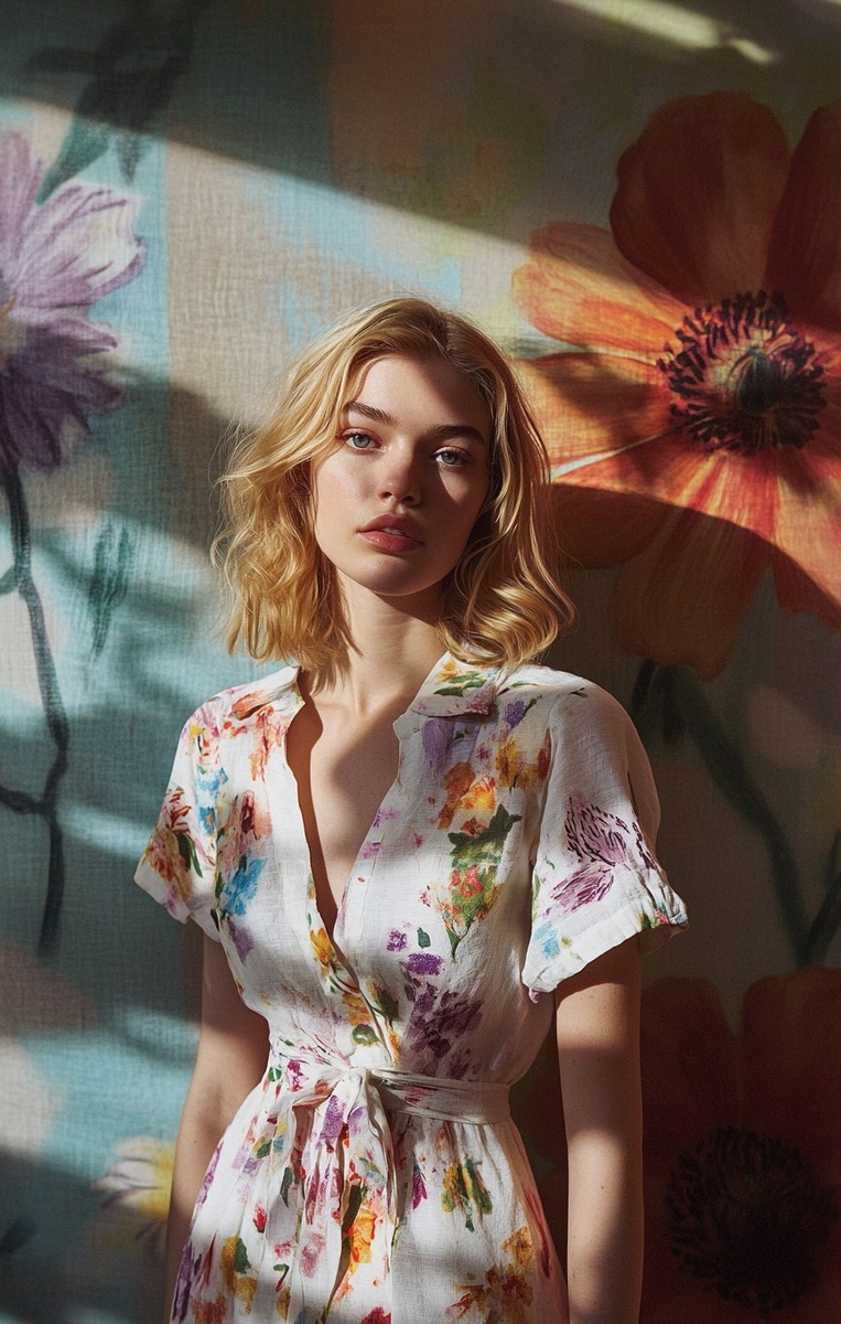 Создано на основе запроса: Generate A photograph of the model wearing an elegant white linen dress with a colorful floral print; the fabric