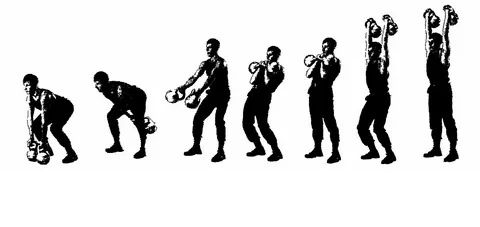 - Толчок: выталкивание гири вверх за счет ног и фиксация над головой.