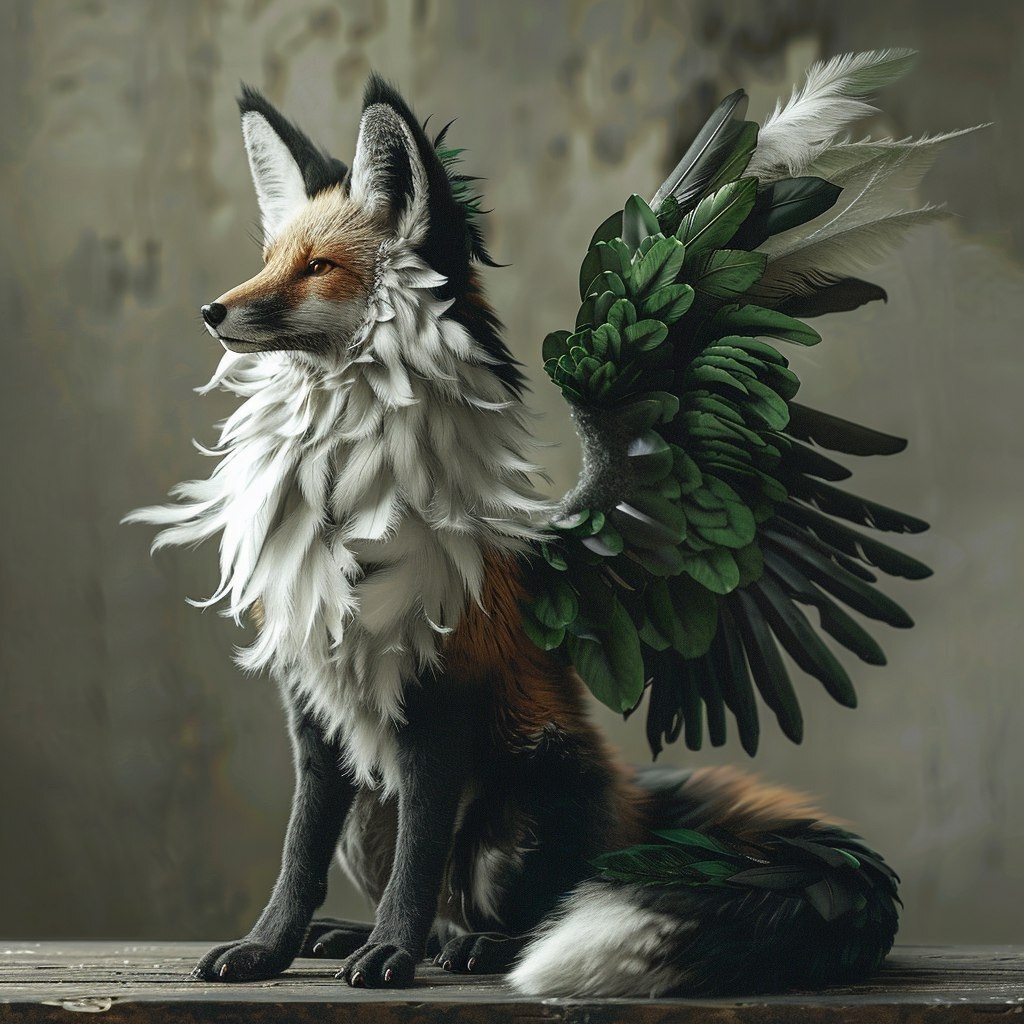 Создано на основе запроса: fox with black and white fur with green parrot wings. Surreal photo realistic