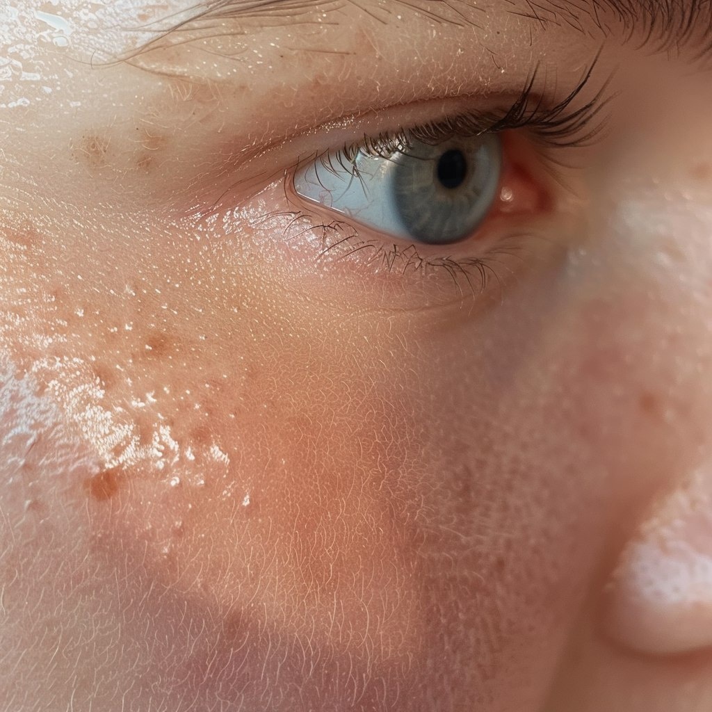 Создано на основе запроса: ultra-realistic close-up of female skin, fair tone, visible pores, mild redness, skin imperfections, no facial