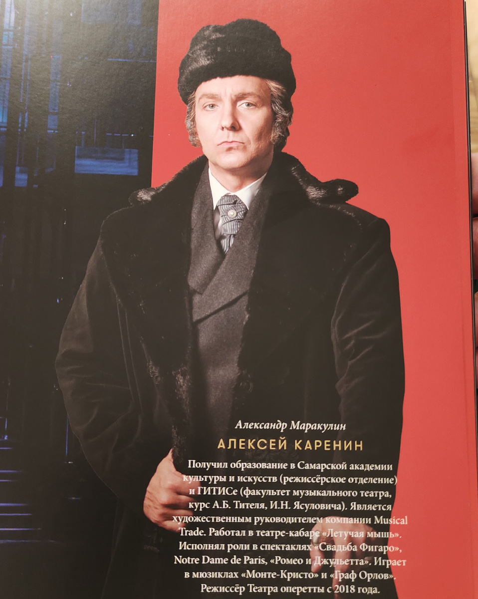 Вообще-то это целая история была с билетами. После того как я побывала на мюзикле "Граф Орлов" и написала об этом статью, мне в личные сообщения пришло письмо от моего подписчика из Самары. Он предложил мне сходить на мюзикл "Анна Каренина", несмотря на то, что я написала в статье, что жанр мюзикла пока не совсем понимаю. Он написал, что Александр Маракулин, исполнявший партию князя Радзивилла, наш с ним земляк, он из Самары. В "Анне Карениной" он будет исполнять партию Алексея Каренина. Кстати, я почему-то не упомянула в прошлый раз в статье Маракулина, хотя да, он прекрасно исполнил партию Радзивилла.