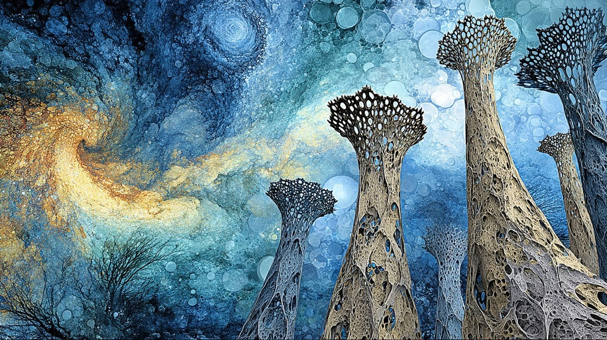 Создано на основе запроса: Bio-Organic Towers with Nebula Reflections Macro architectural study of Zetan alien bio-organic towers on Nibiru, surface textures inspired by coral and bone, photographed in infrared to reveal unseen heat flows, sky above swirling with astrophotographic galaxies in the painterly composition of Starry Night, rich with bokeh star clusters and refracted lens halos. --- Автоперевод: Биоорганические башни с туманностью отражения макро-архитектурные исследования дзетанских биоорганических башен на нибиру, поверхностные текстуры, пронзившие кораллы и кости, сфотографированные в инфракрасных изделиях, чтобы раскрыть невидимые тепловые потоки, небо над циркульными с астрофотографическими галактиками в художественных составе ночи звезд, богатых звездами и в рекансах. Как тебе эта иллюстрация? 🤔 https://dzen.ru/id/65c0c65c86e4f837c27b24d7 #ИИ #AI #нейросеть #midjourney #art