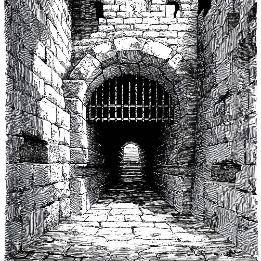 Создано на основе запроса: a black and white ink drawing of passageway blocked by an iron portcullis, in the style of the interior art from