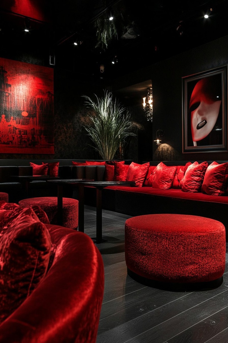 Создано на основе запроса: Red and black lounge club interior design, with plush seating and red pillows against a dark background, accented