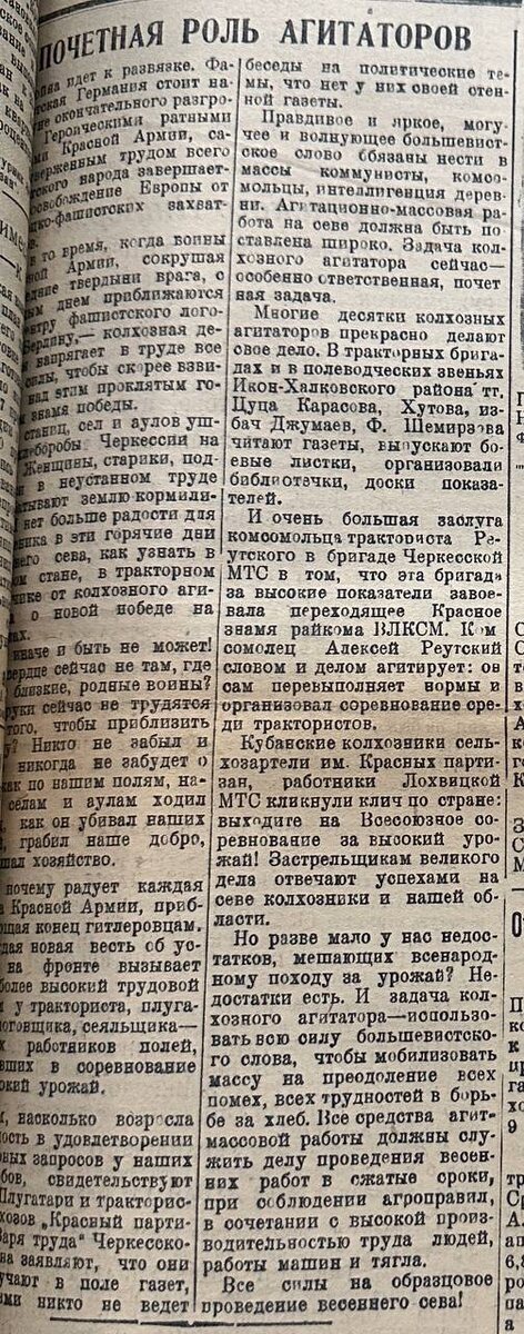 РИА «Карачаево-Черкесия» стало партнером просветительского проекта Дзен к 80-летию Великой Победы, в рамках которого будут опубликованы материалы, выходившие в газете «Красная Черкессия» (сегодня это «День республики») в 1945 году. Мы расскажем, чем жила Карачаево-Черкесия с 8 апреля по 13 мая 1945 года и как она встретила долгожданную Победу. Война идет к развязке. Фашистская Германия стоит на пороге окончательного разгрома Героическими ратными силами Красной Армии, самоотверженным трудом всего советского народа завершается освобождение Европы от немецко-фашистских захватчиков. В то время, когда воины Красной Армии, сокрушая последние твердыни врага, с каждым днем приближаются к центру фашистского логова – Берлину, – колхозы напрягают в труде все силы, чтобы скорее взвилось над этим проклятым городом знамя победы. Из станиц, сел и аулов ушли хлеборобы Черкессии на поля. Женщины, старики, подростки в неустанном труде обрабатывают землю-кормилицу. И нет больше радости в эти дни горячег