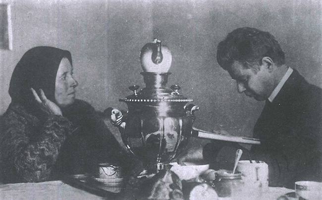 На этом редком и трогательном фото — Сергей Есенин с матерью Татьяной Фёдоровной, март 1925 года, Москва. Поэт сидит за столом, словно на минуту отложив шум литературной жизни и бурю внутренних переживаний. Перед ним — самовар, чашки, баночки с мёдом или вареньем. Обычная домашняя сцена, наполненная тихим светом и каким-то особым покоем. Есенин что-то читает, мать внимательно слушает — в этом кадре удивительно много нежности и живого чувства.