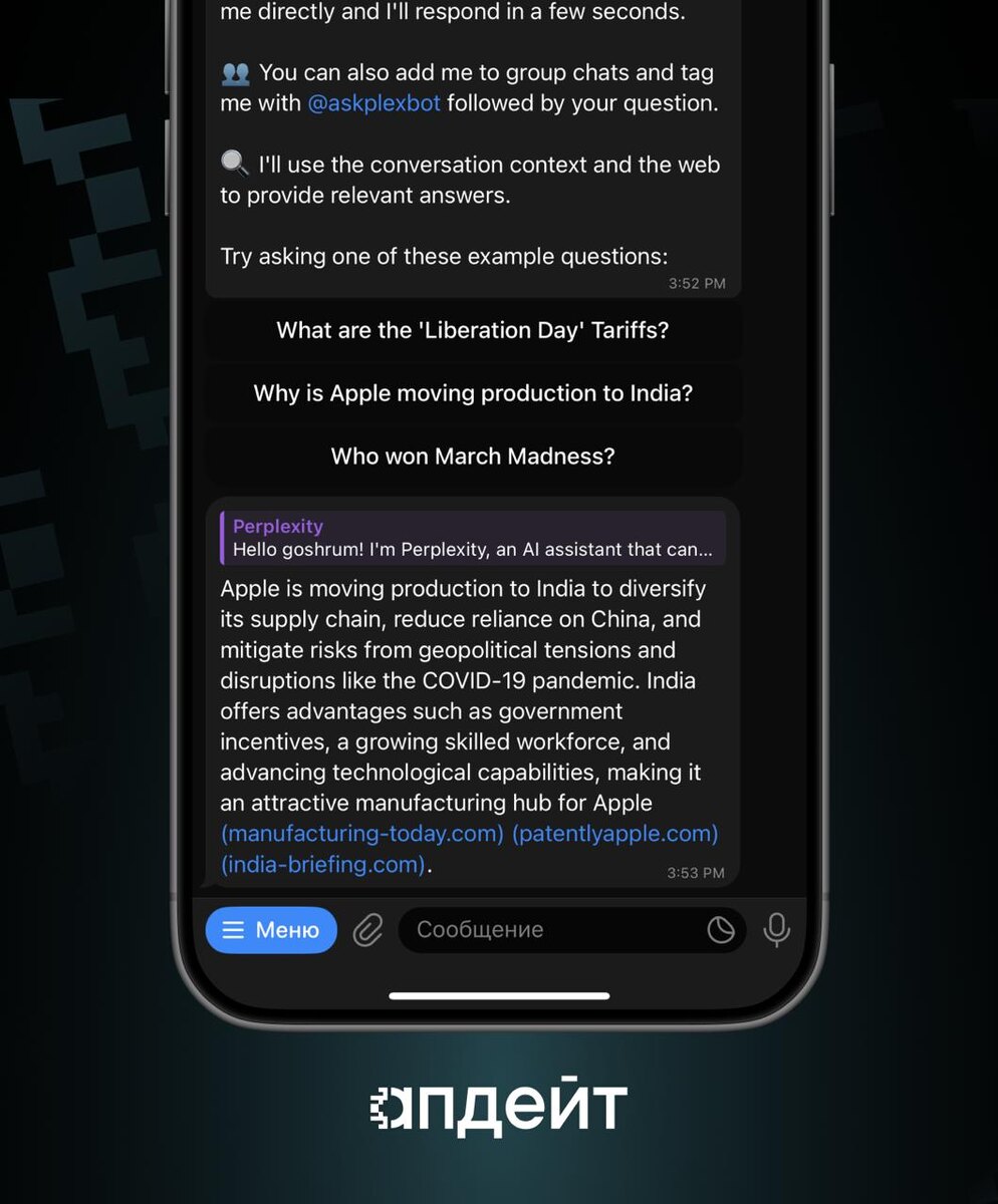 π¬Perplexity ΠΏΠΎΡΠ²ΠΈΠ»ΡΡ Π² Telegram ΠΠΎΠΏΡΠ»ΡΡΠ½ΡΠΉ ΠΠ-Π°ΡΡΠΈΡΡΠ΅Π½Ρ, Π·Π°ΠΌΠ΅Π½ΡΡΡΠΈΠΉ ΠΌΠ½ΠΎΠ³ΠΈΡ