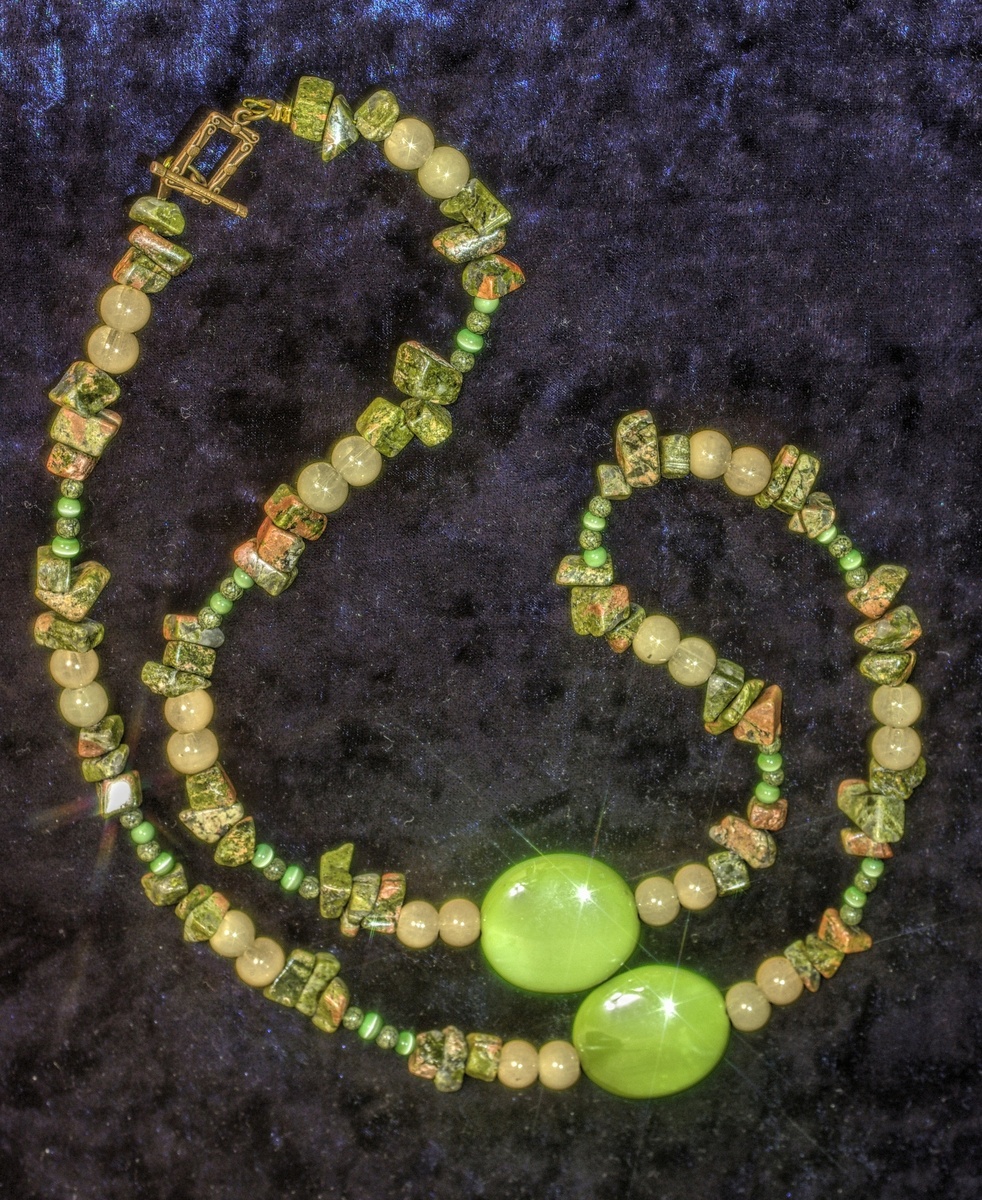 Первое фото. Бусы из яшмы и змеевика. Немного разбавила стеклянными матовыми бусинами. Застёжка тогл.