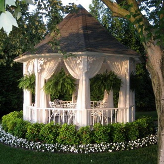 Не малое значение имеет освещение. Оно играет важную роль имеет важную роль. Одним из самых популярных решений являются гирлянды. Они могут быть: С крупными лампочками — для эффекта ретро-вечеринки; Светодиодными и миниатюрными — для создания нежного, сказочного свечения; С разнообразными насадками — в виде шаров, звезд, цветов. Развесьте гирлянды по балкам, обмотайте ими опоры, пускайте по периметру — главное, чтобы свет был мягким и тёплым. Отличное дополнение — фонари на солнечных батареях вдоль дорожки, ведущей к беседке. Они подчеркнут красоту ландшафта и сделают путь безопасным в темное время суток. Особенно интересно смотрится сочетание нескольких типов подсветки — например, гирлянд под крышей и фонариков вдоль ступеней. Цветы