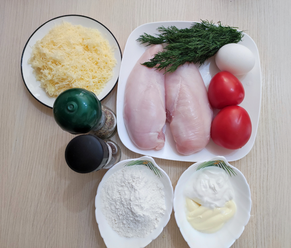 Друзья, всем привет! Доброго дня и отличного настроения всем! Сегодня на ужин давайте приготовим быстрое, вкусное блюдо. Подойдёт оно к любому гарниру и просто, как самостоятельное блюдо. Будем готовить рубленые куриные котлеты с помидорами и зеленью. Нам понадобится: филе куриное 2 шт., 2 небольших помидора, 1 яйцо, по 1 ст.ложке сметаны и майонеза, 70 гр. тёртого сыра, 3 ст. ложки муки, немного укропа, соль, перец, немного растительного масла для жарки.