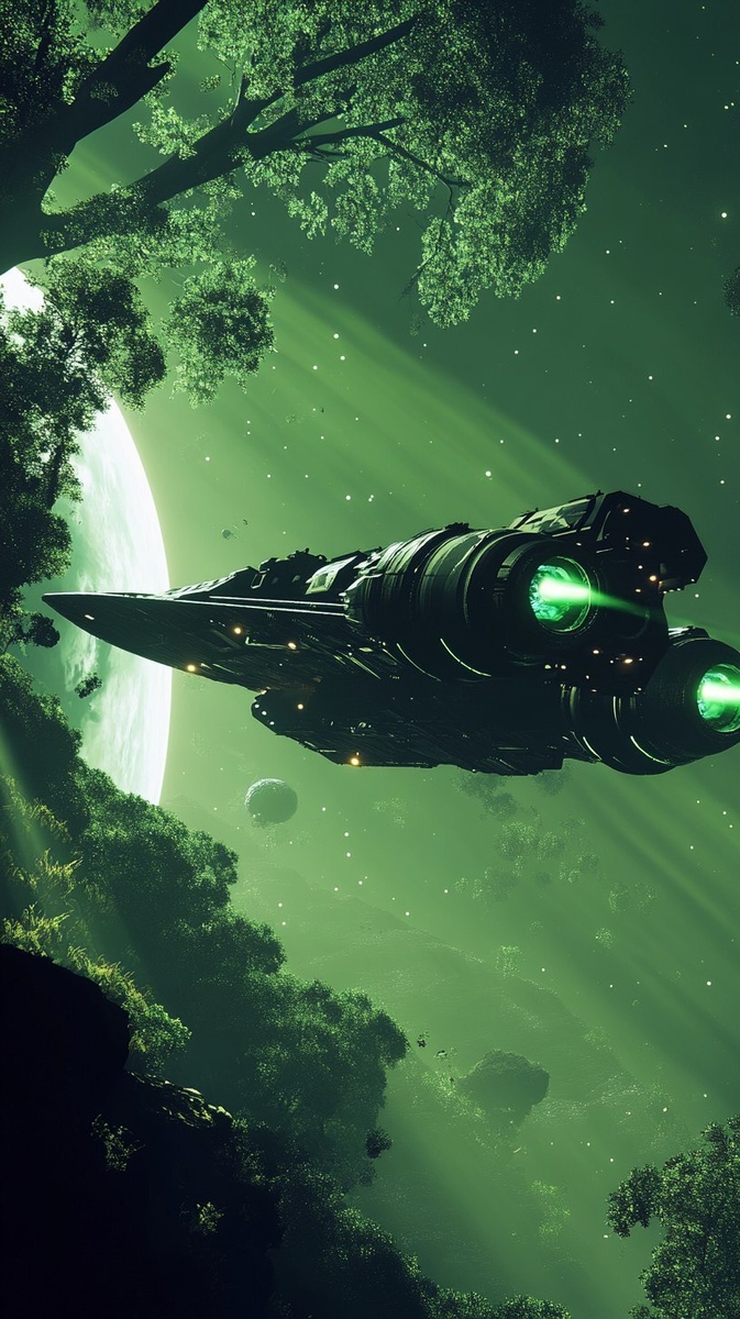 Создано на основе запроса: Bright green engine light emanates from the back of a starship as it makes an approach to a lush green forested