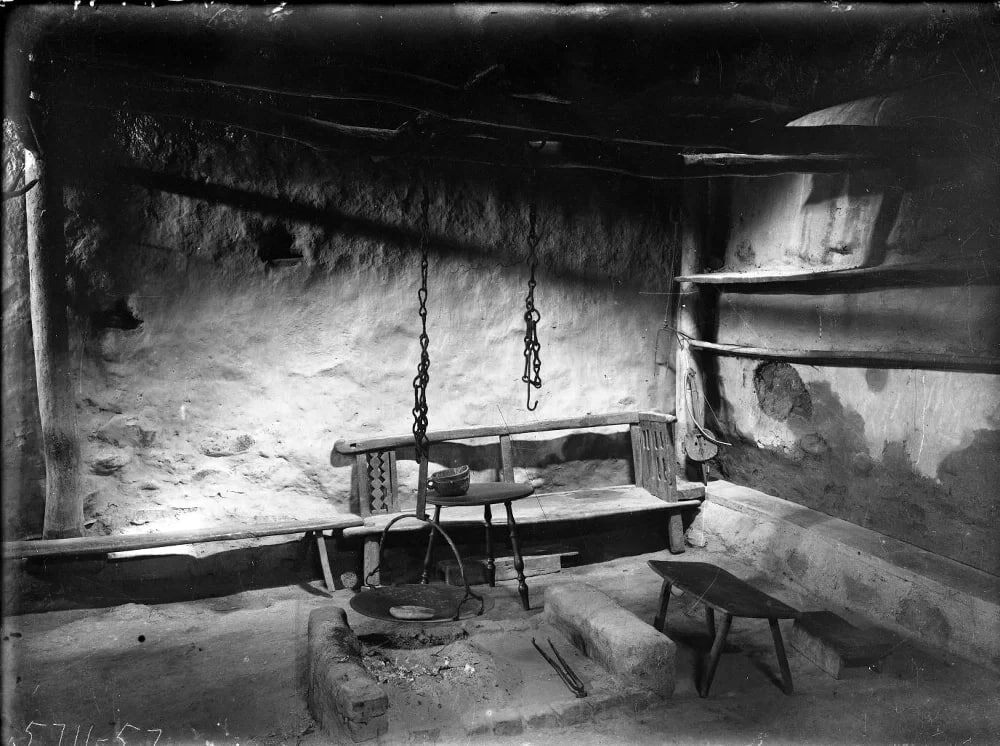 Внутренний вид части дома в Ахсау «Внутренний вид осетинского дома каменного с земляным полом. На переднем плане очаг со стоящими около резным диваном и несколькими низкими скамеечками. Около очага висит старинный железный светильник в виде круглой подставки, на которую клали лучину или бересту. Поставка подвешена на цепочках, украшенных бараньими головками. На стене, в глубине комнаты устроена полка и завалинка, на которых расставлена посуда» (из описания в коллекционной описи). В большей части истории горских народов, включая осетин, семейный коллектив размещался в доме, состоявшем из одного жилого помещения. В нём не было перегородок, но члены семьи строго размещались по зонам, соответствующим их полу и возрасту. Организовывали пространство жилища главный опорный столб и очаг. Наиболее почетное место находилось за очагом и предназначалось старшему мужчине в семье, правая часть интерьера принадлежала мужчинам, левая — женщинам. Фотографы: Гречкин А.А., Сегеркранц В.В.