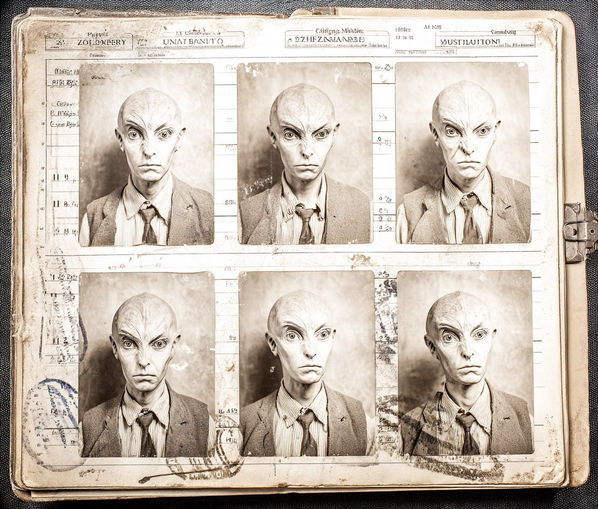 Создано на основе запроса: Vintage mugshot photo series of multiple Zetan aliens from Nibiru, each captured in sequential booking shots with varying emotional expressions, photographed with 1950s flashbulb setup, cracked plaster backdrop and visible clipboard notes written in alien script, heavy vignette and fingerprint smudges on image edges --- Автоперевод: Винтажная серия фотографий Mugshot из множества Zetan Aliens из Nibiru, каждая из которых снимается в последовательных снимках бронирования с различными эмоциональными выражениями, сфотографированным с настройкой вспышки 1950 -х годов, потрескавшимся гипсовым фоном и визуальными нотами буфера обмена, написанными в сценарии инопланетян, тяжелой виньетке и отпечаткам пальца на краях изображения Как тебе этот вариант? 🤔 https://dzen.ru/id/65c0c65c86e4f837c27b24d7 #ИИ #AI #нейросеть #midjourney #art