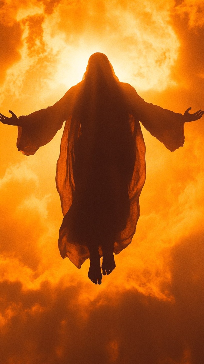 Создано на основе запроса: bathed in glorious orange light, photorealistic silhouette of god floating toward the camera, fully robed