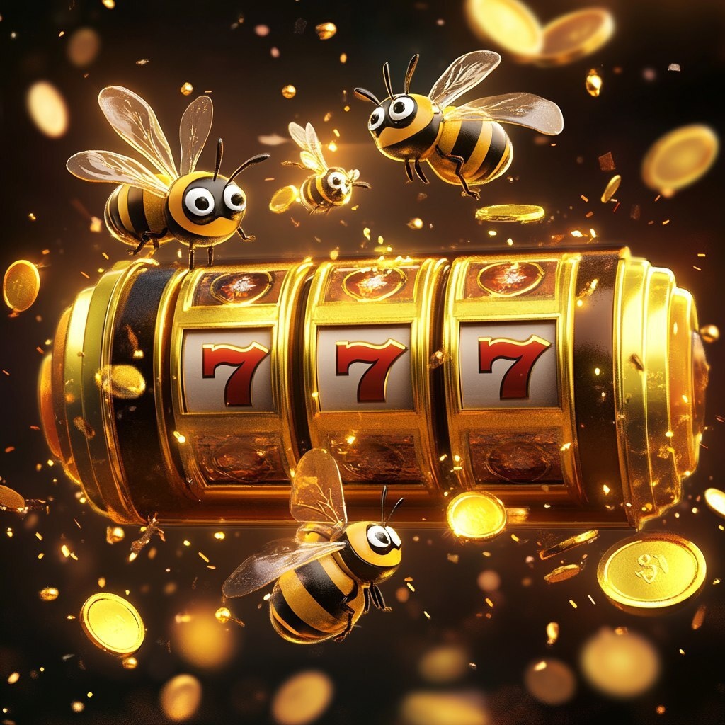 Создано на основе запроса: A high-energy slot machine jackpot scene featuring bees as the main theme. The slot machine is golden and dazzling, surrounded by glowing lights, sparkles, and flying golden coins. Three matching bee icons align on the reels, signaling a jackpot win. Bees with big eyes and translucent wings hover joyfully around the machine, their expressions full of excitement. The atmosphere is festive and magical, with bright bursts of light, celebratory confetti, and shimmering reflections. Ultra-vibrant color palette, smooth 3D-style rendering, soft lighting effects, and high detail ideal for casino-themed artwork.
