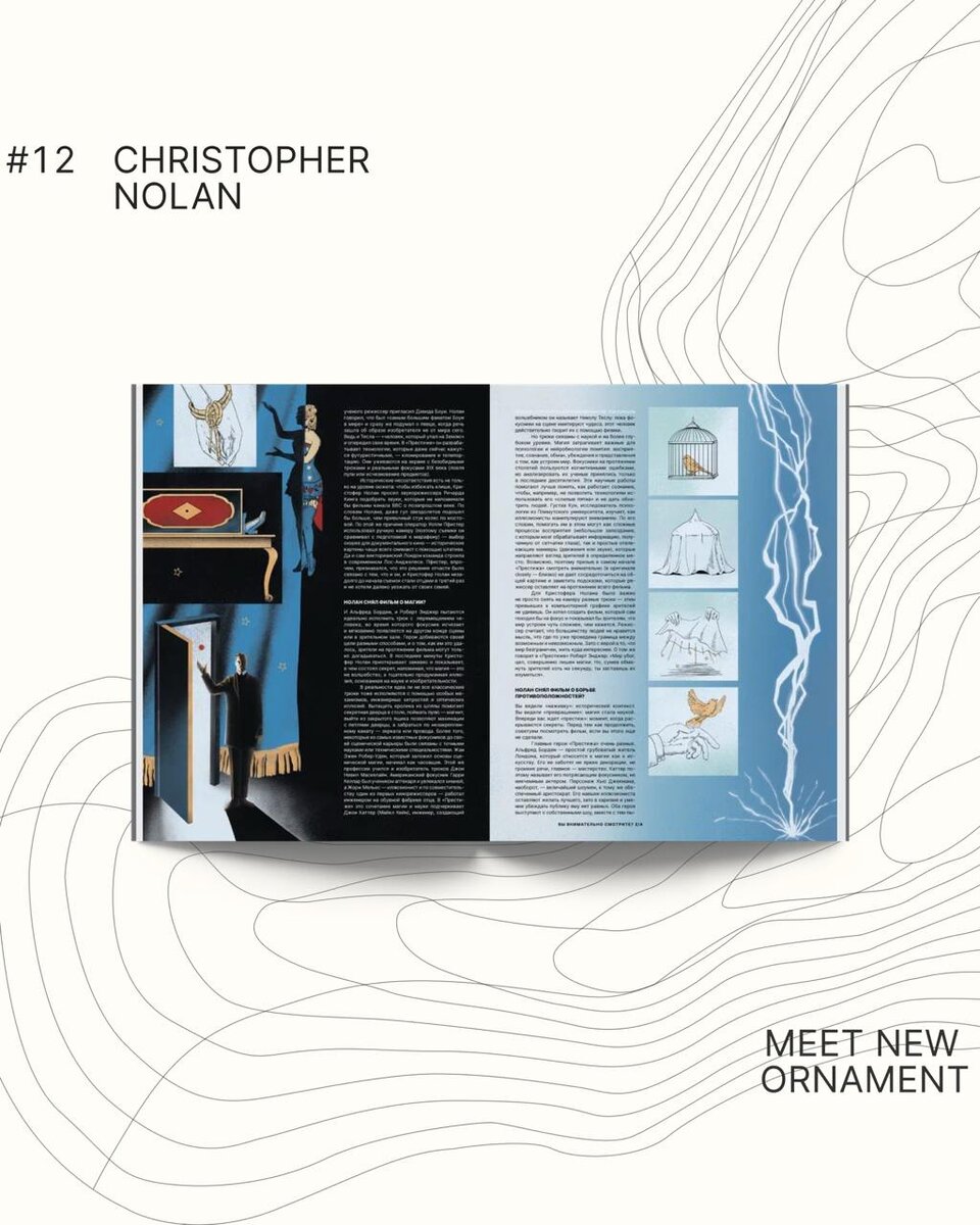 Журнал о кино Ornament выпустил новый номер, посвященный Кристоферу Нолану. 12-й выпуск журнала раскроет особенности киноязыка голливудского кинорежиссера. В номере содержатся четыре тематических главы, которые рассказывают о творческой жизни Нолана: начало («Начало» и путь в кино), хаос (трилогия о Бэтмене), любовь («Престиж», «Интерстеллар», «Оппенгеймер»), память («Дюнкерк», «Довод», «Помни»). Каждый текст в выпуске сопровождается оригинальными иллюстрациями художников Ornament'a — над версткой работали Катя Макарова, Ваня botvvinky, Оля Владимирова, Саша Черепанов, Сергей Спесивцев.