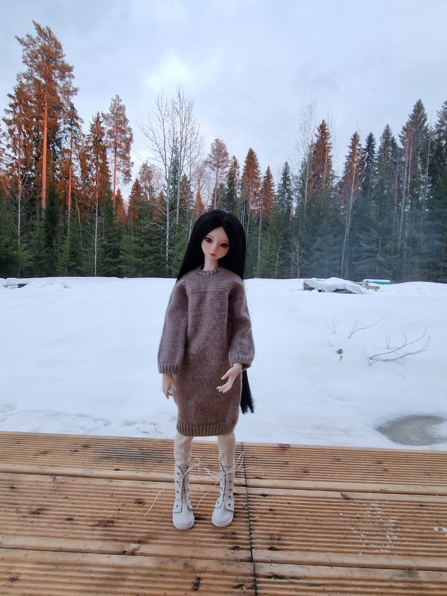 У всех на дачах трава. У нас пока снег. Связала платье для Саши. С ростком, всё как полагается. Всё ещё пытаюсь нащупать её образ. Так уже лучше, но что-то всё равно меня смущает. Пока оставлю так. Может, придёт озарение.