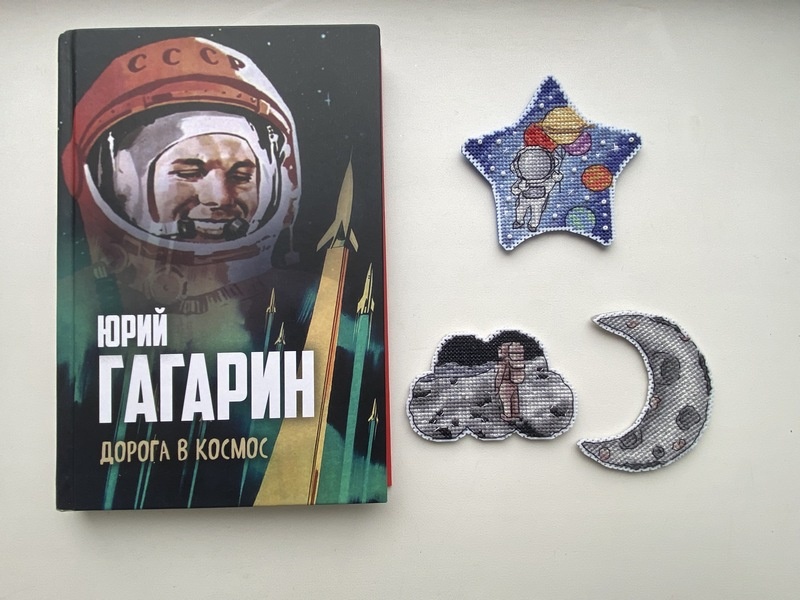 Сегодня, 64 года назад в космос полетел первый человек. Юрий Гагарин сказал своё знаменитое "Поехали!" и мир изменился! В этот день у нас в доме всегда праздничный стол ведь это мой студенческий профессиональный праздник." По образованию я инженер-технолог самолетостроения и уже не помню почему, но именно в этот день мы собирались дружной компанией и отмечали свой праздник. Поэтому иногда балую себя рукодельными работами на космическую тему. В этот раз покажу вам аж три миниатюры, вышитые по авторским схемам. Эту книгу и еще одну мне подарили мои постоянные покупательницы. Зная мою любовь к космосу специально их купили в Звездном городке. Это так приятно! Виктория, Лариса спасибо большое ещё раз! Честно скажу, книжки я еще не читала. Сейчас вообще мало читаю) Больше слушаю. Но с удовольствием посмотрела фотографии в книге "Первый в космосе". Интересно смотреть на вырезки из газет, плакаты, фото из космоса итд. Поэтому решила поделиться ими с вами, используя их как фон для вышивки. И р