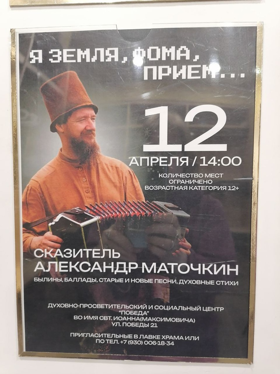 12 апреля в День космонавтики появилось такое интересное для меня предложение - пойти на исполнение духовных песнопений, русских старин, былин, даже новых песен в исполнении Александра Маточкина. Мне захотелось посетить это мероприятие, тем более, что я давно слышала это имя. Наконец звёзды сошлись. Само место, где мы собрались, было необычно - это духовно-просветительский центр, оборудованный в сталинском доме, недалеко от м. Парк Победы. Здесь недавно прошёл ремонт, и интерьеры выглядят так: Александру 47 лет, он филолог, окончил ЛГУ, ездил на практику в деревни собирать фольклор. Он застал ещё тех живых носителей фольклора, который ему передали это мастерство. Сейчас традиция в деревнях угасает. Но интерес к нашей традиционной культуре есть, не случайно Александр Маточкин ездит по разным городам, куда его приглашают, выступает и находит благодарный отклик в сердцах людей. Мы слушали в исполнении Александра духовные песнопения разных эпох - и 17, и 19, и 20. Даже современную духов