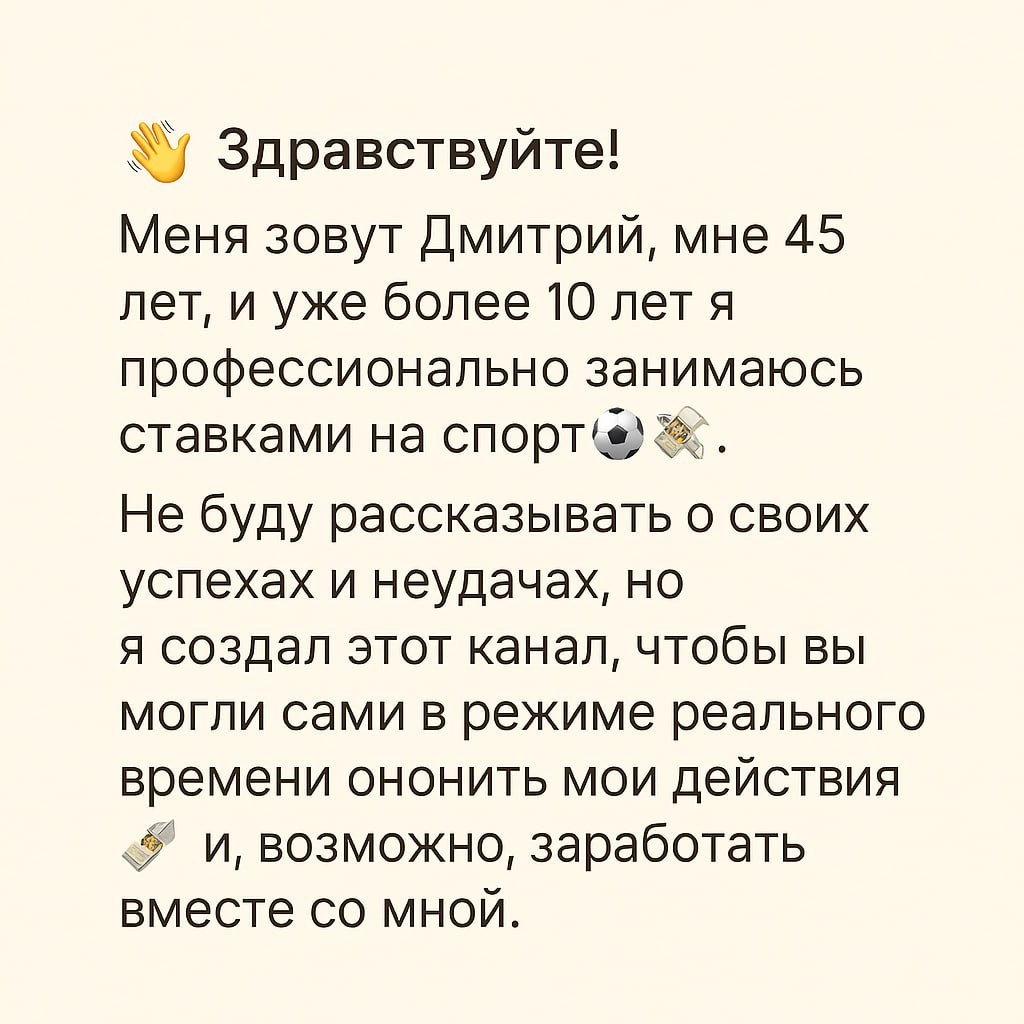 🎯 Приветствую вас, друзья! Меня зовут Дмитрий, мне 45 лет. Уже более 10 лет моя жизнь связана со ставками на спорт ⚽️💸 — это не просто увлечение, а моя профессия и ежедневная работа. Не буду рассказывать о своих победах 🏆 или поражениях ❌ — всё предельно просто: я создал этот канал, чтобы вы могли в режиме реального времени наблюдать за моими действиями 📊 и делать выводы сами. Моя цель — честность, открытость и результат. А если в процессе вы сможете заработать вместе со мной — значит, всё делаем правильно 💰🔥 Добро пожаловать в Capper’s Den 👑 — здесь решают опыт и холодный расчёт 🎲