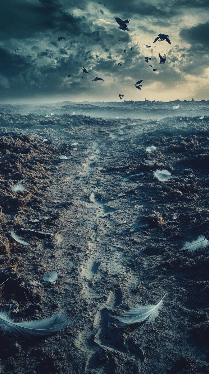 Создано на основе запроса: a ghostly trail winding across barren land, scattered belongings and feathers on the ground, symbolic tears
