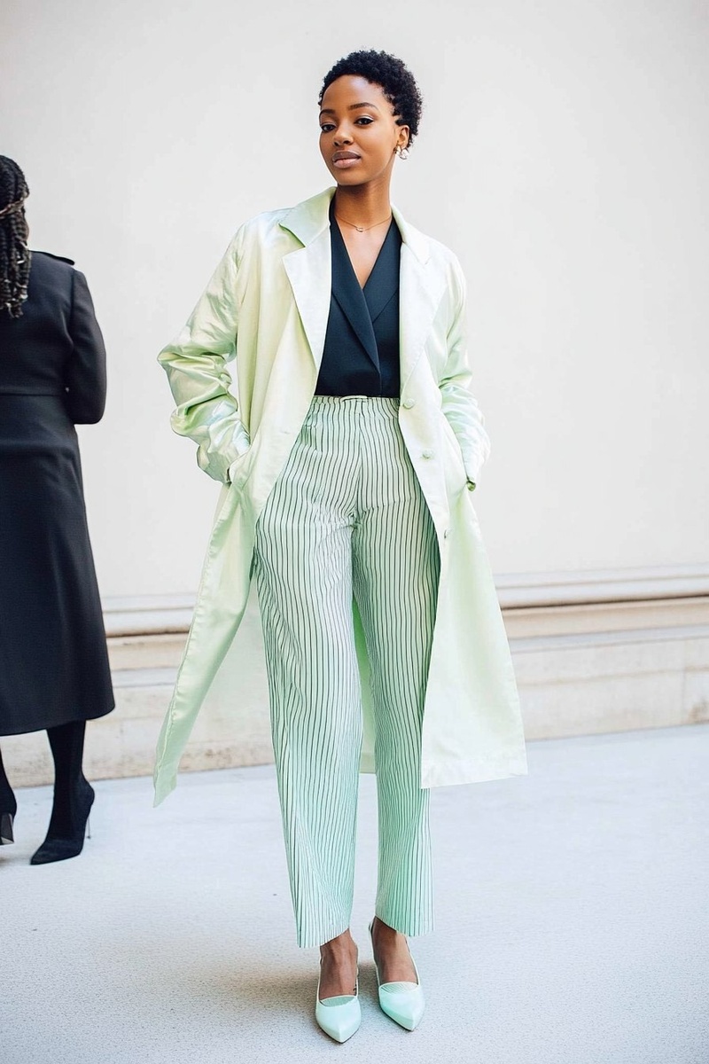 Создано на основе запроса: standing black model wearing light green shimmery pants, stiff fabric, tomboyish baggy fenminine trousers, , silky fabric, long sleeved long navu striped coat, she has short pixie haircut, light skinned, modern, trendy, white bckground studio shoot