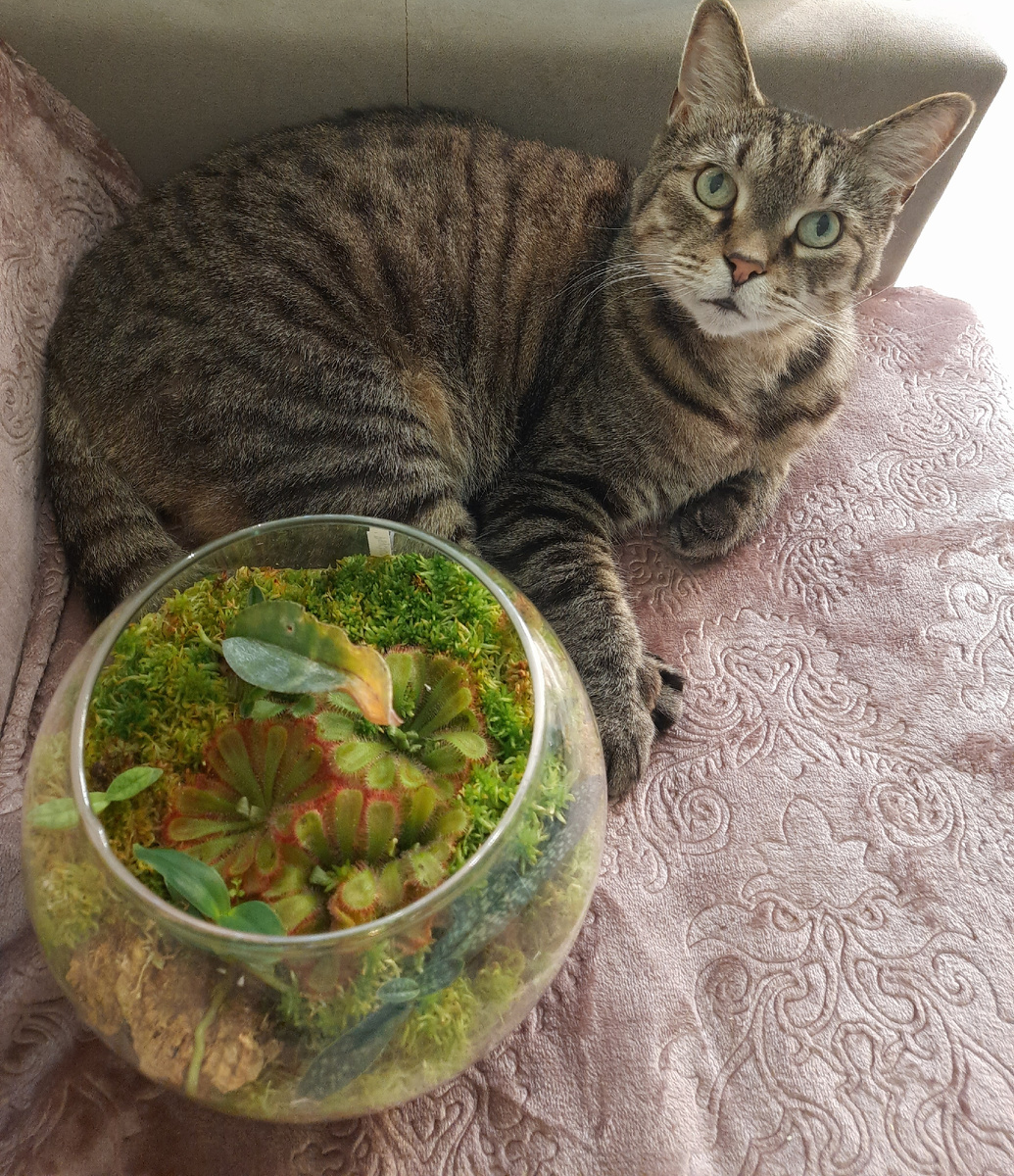 Приветствую всех. Часто мелькают посты с вопросами про реанимацию орхидей, наращивание корневой. Не открою этим постом Америки, но для тех , кто не знает, хотелось поделится способом для ленивых, которым жалко выкидывать орхидейные огрызки или черенки других растений и лень тратить свое время на полив и танцы с бубнами. Растения, не только орхидеи, оживают на живом мхе. Они хорошо наращивают корневую просто воткнутые в живой сфагнум. Изначально, аквариум задумывался, как дом для росянки. Все было по взрослому: дренаж из пеностекла, грунт кислый торф+перлит примерно поровну, сверху грунта выложила сфагнум из леса и сунула во всё это росянку. И под лампу Эра. Поставила на полку к мелочи и реанимашкам. Но потом что-то пошло не так, и я стала давать шанс практически нежизнеспособным растениям, просто торкнув их в мох к росянке под бок. В итоге, уже скоро надо и росянку делить и пересаживать, и с орхидеями что-то придумывать. Уже раза три стригла газон сфагнума. Растет хорошо. Полив с