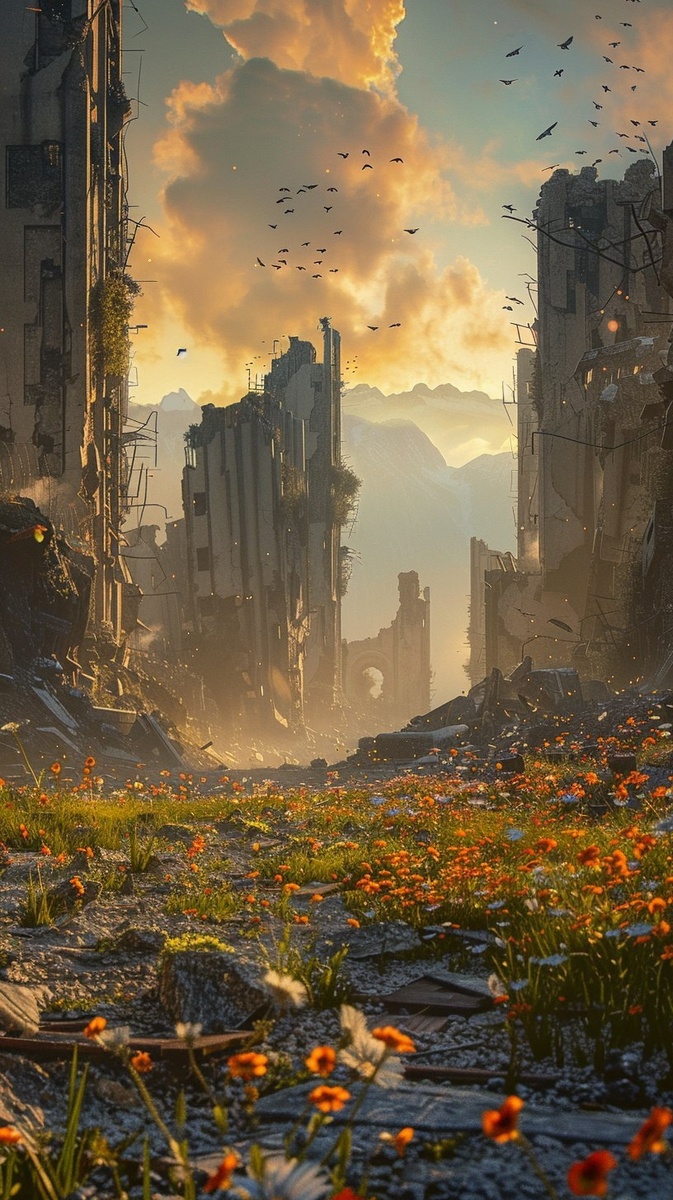 Создано на основе запроса: a high-resolution cinematic view of a futuristic ruined city merging with nature, morning fog drifting between crumbling towers, wildflowers growing through cracked pavement, mountains in the distance glowing in early sunlight, peaceful post-apocalyptic beauty, photorealistic, --- Автоперевод: Кинематографический вид с высоким разрешением на футуристический разрушенный город, слитый с природой, утренний туман, дрейфующий между рушащимися башнями, полевые цветы, растущие через потрескавшуюся тротуар, горы в расстоянии, светящиеся при раннем солнечном свете, мирная постапокалиптическая красота, фотореалистическая, Красиво выглядит? 🤔 https://dzen.ru/id/65c0c65c86e4f837c27b24d7 #ИИ #AI #нейросеть #midjourney #art