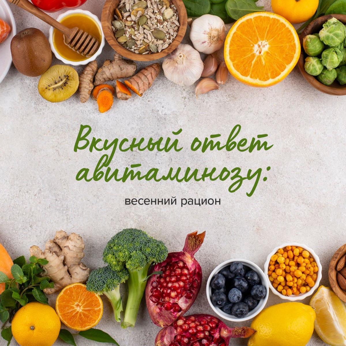 Весна — время, когда организм начинает отчаянно требовать витаминов и свежих продуктов.📢 Как помочь ему в этом? С помощью здорового весеннего меню! А мы Вам расскажем, какие продукты для этого подойдут. 🌿Зелень на страже здоровья Зелень — это настоящий кладезь витаминов и минералов. Шпинат, руккола, укроп, петрушка — все они богаты витаминами А, С и К. Добавляйте их в салаты, смузи или просто украшайте ими блюда. Ваша тарелка станет не только полезной, но и яркой! 🍋Цитрусовые — солнечные витамины Апельсины, мандарины, грейпфруты — это солнечные витамины, которые помогут поднять настроение и укрепить иммунитет. Витамин С в них, как солнечный лучик в пасмурный день! Ешьте их свежими или добавляйте в салаты и десерты. 🥕Морковь и свёкла — корнеплоды здоровья Морковь и свёкла — это настоящие супергерои среди овощей. Они богаты витаминами А и К, а также клетчаткой. Морковный сок или салат из свёклы с чесноком и сметаной — это не только вкусно, но и полезно. 🍓Ягоды — сладкие витамины