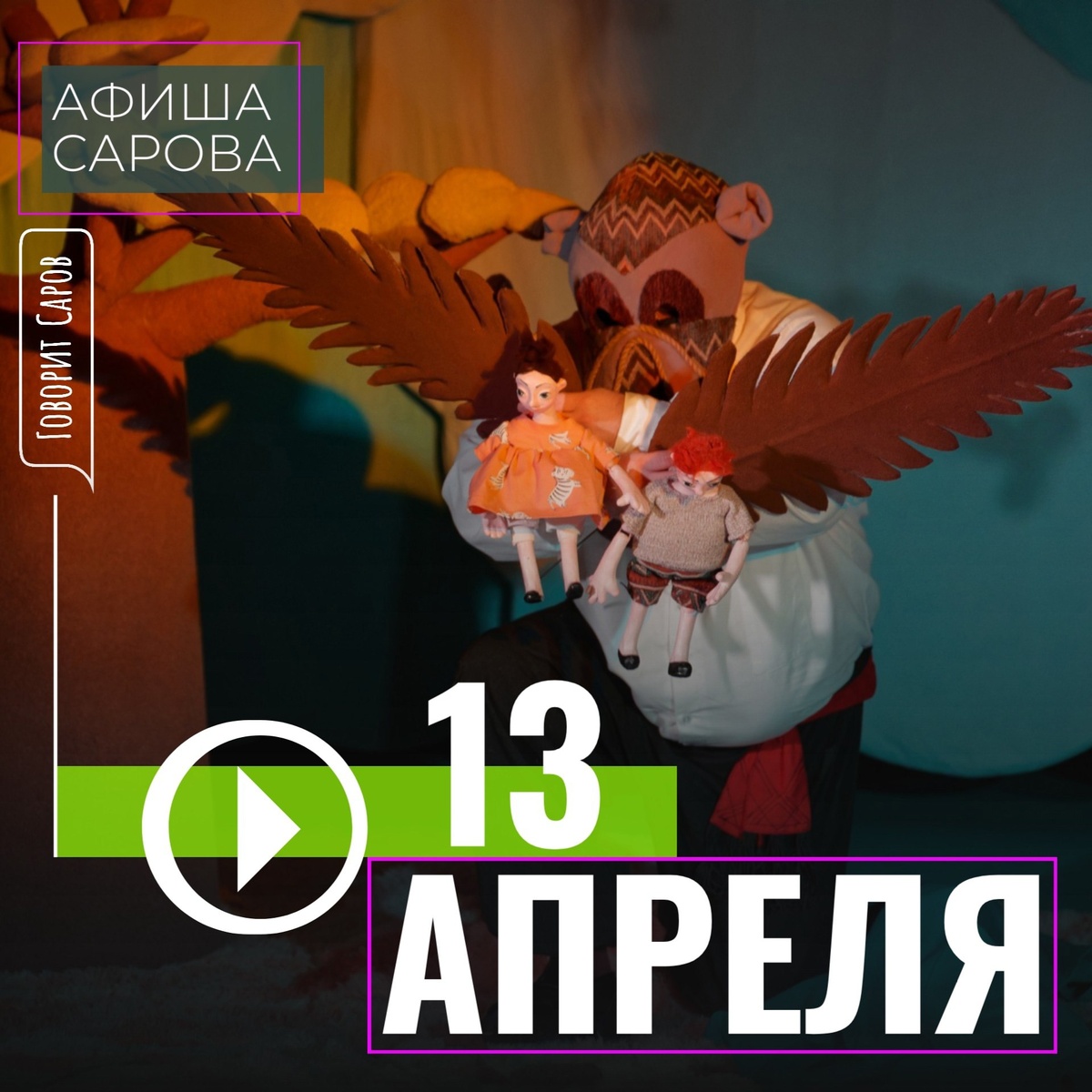 ↗ ЧТО ГДЕ ПРОИСХОДИТ В САРОВЕ 13 АПРЕЛЯ 🧸Театр кукол «Кузнечик» (ЦКР на ул.Менделеева, д.50а, тел. 9-83-83, 9-83-82) 11:00, 16:00 П Р Е М Ь Е Р А! «Бр-р-малей», К. Чуковский (Спектакль рекомендован к просмотру детям с 4-х лет) 🏛ЦКиД РФЯЦ- ВНИИЭФ (площадь Ленина, 11, тел. 3-42-98) 17:00 Концерт Народного коллектива камерного хора "Голоса Сарова" ( рук Заслуженный работник культуры РФ В.Богоявленская), 6+ Цена билета:200 руб 🎟Любительский театр "Импровизация" 14:00 Макаки, пицца и деструкция, 12+ (ЦРК на Менделеева, 50А) 👫Дом Молодежи (ул. Зернова, д.64, тел.9-82-52, 9-82-59) Танцевальный клуб для тех, кому за… «В стиле ретро», 18+ 🥅Ледовый дворец (ул. Московская, 5, Саров, тел. 9-49-14) 08:30-10:30 Первенство ПФО по хоккею среди детско-юношеских команд ХК «Саров-13»-ХК «Гвоздика-13» (г.Ижевск) 20:00-21:30 Массовое катание на коньках 🎳Клуб "PRIME" (ул. Силкина, 31, тел. 2-77-36) 11:00 8 тур Боулинг-лиги г.…
