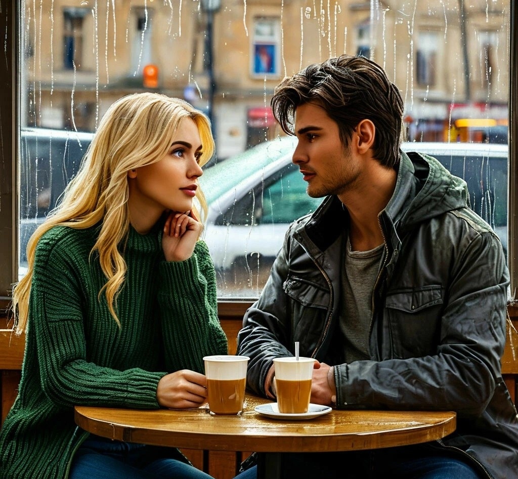 Двери кафе открылись, извещая звоном колокольчика о новом госте. Это была светловолосая, среднего роста девушка. С широкой улыбкой и голубыми, как море, цветом глаз. Женщина сняла свой плащ, оставаясь в зелёном свитере, джинсах и чёрных кроссах, которые были мокрые от дождя. Сложа зонт, женщина повесила всё это на вешалку и направилась в самый дальний угол зала в кафе. В углу уже сидел некий мужчина. Лет ему можно было дать тридцать шесть, не больше. Его иссиня-чёрные волосы были уложены на бок. Он мило улыбнулся женщине и пригласил присесть.
