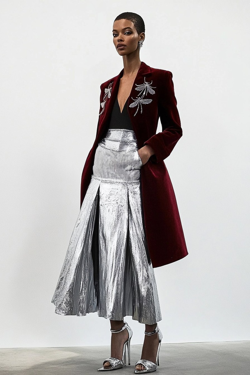 Создано на основе запроса: standing black model wearing silver skirt stiff fabric, silky fabric,maroon coat with leather dragonfly embroidery, high heeled shoes, she has short pixie haircut, light skinned, modern, trendy, white bckground studio shoot