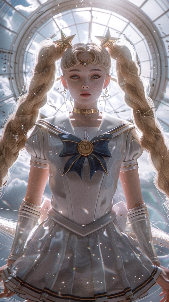 Создано на основе запроса: super realistic 3D anime girl Sailor Moon in crystal palace, dynamic circling shot, flowing golden twin braids