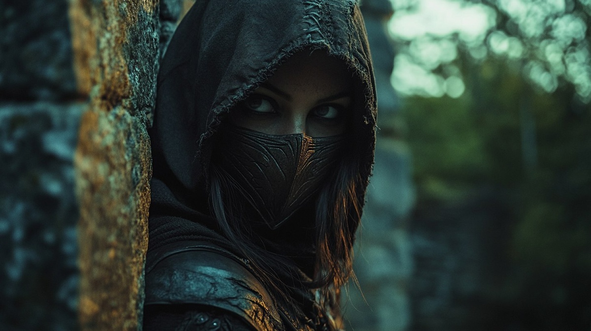 Создано на основе запроса: cinematic photo of a hooded female with a mask and they are looking around a corner all stealth, set in a fantasy