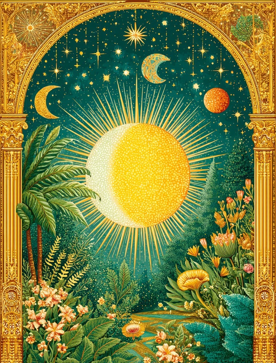Создано на основе запроса: Nibiru celestial tapestry with stars, moons, and planets in the style of an Art Nouveau illustration, dark blue background, yellow moon, greenery, gold foil accents, vintage-inspired, in the style of Yoshitaka Amano. --- Автоперевод: Нибиру небесный гобелен со звездами, лунами и планетами в стиле иллюстрации искусства, темно-синего фона, желтой луны, зелени, золотой фольги, винтажных, в стиле Йошитака Амано. Как тебе это изображение? 🤔 https://dzen.ru/id/65c0c65c86e4f837c27b24d7 #ИИ #AI #нейросеть #midjourney #art
