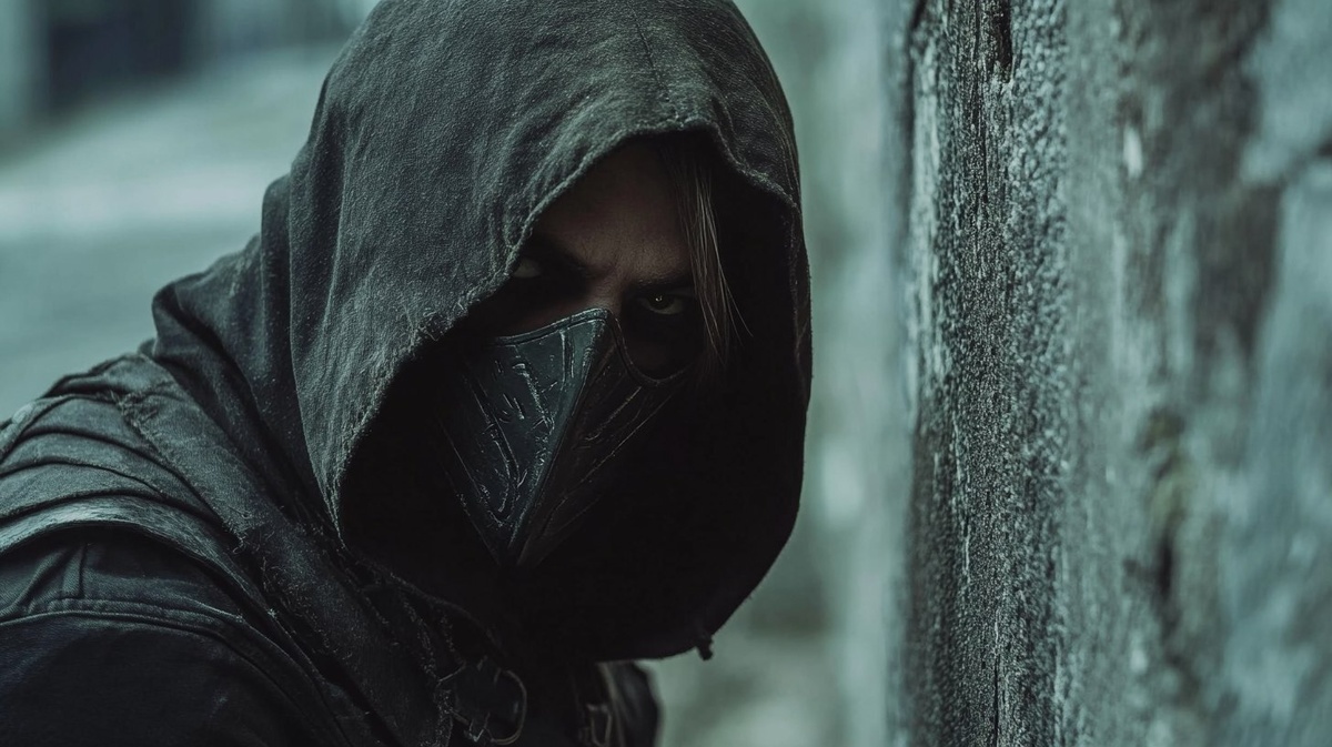 Создано на основе запроса: cinematic photo of a hooded man with a mask and they are looking around a corner all stealth, set in a fantasy