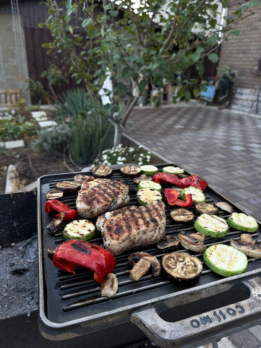 Ингредиенты: * куриная грудка 1 шт. средняя; * Кабачок 1 шт; * Баклажан 1 шт; * Перец болгарский 1 шт; * Шампиньоны 6 шт; * Петрушка; * Масло оливковое. Специи: * Перец чёрный; * Чеснок сушеный; * Соль; * Базилик. Соус: * Майонез 4 ст.л; * Кетчуп; * Укроп; * Петрушка; * Кинза свежая; * Чеснок 2 зуб. Приготовление: 1. Маринуем грудку специями и сверху поливаем маслом. 2. Нарезаем овощи, соли, посыпаем чесноком и поливаем маслом. 3. Кладем на прогретый гриль грудку и овощи. Прожариваем с одной стороны 15 минут и с другой стороны 10 минут. 4. Наша куриная грудка BBQ готова! Приятного аппетита!