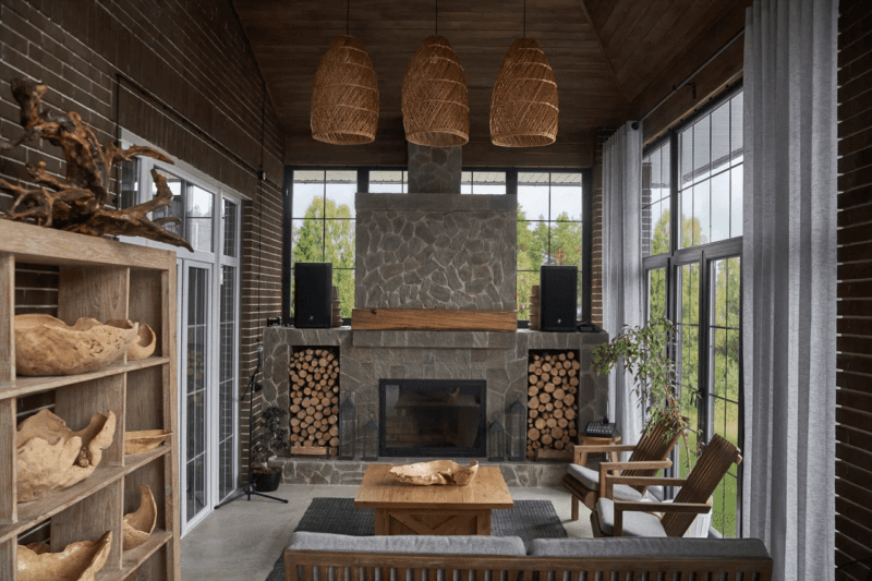 Стены веранды из кирпича Terca коллекция Terra шоколадно-коричневого оттенка,белые и антрацитовые окна компании Shuco добавляют интерьеру