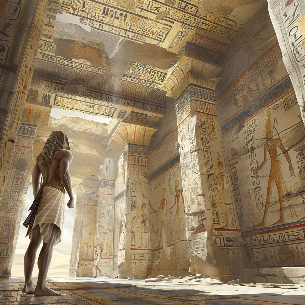 Создано на основе запроса: ancient egyptian pharo, standing tall, looking straigh in a hall with drawings on the walls