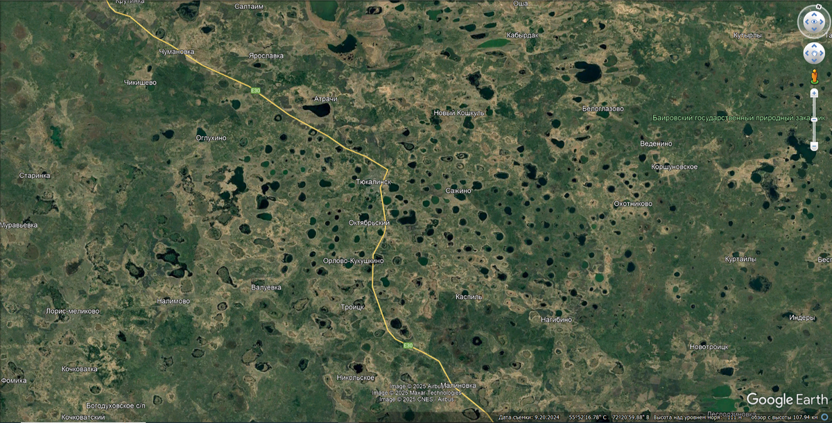 На фрагменте карты Сибири представлен только маленький участок ее огромной территории, и даже на нем видна россыпь большого количества озер, в том числе и круглых.