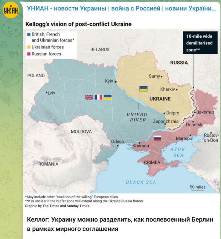 Из новостей: спецпредставитель Дональда Трампа по Украине генерал Кит Келлог предложил план прекращения огня, при котором Украину можно было бы фактически разделить на зоны влияния, как это было с Берлином после Второй мировой войны. По его словам: Россия контролирует восток Украины, а на западе могут появиться британские и французские силы, как часть «гарантийной миссии»; между ВСУ и ВС РФ предлагается создать буферную зону шириной 18 миль; новые выборы на Украине могут пройти после заключения перемирия.