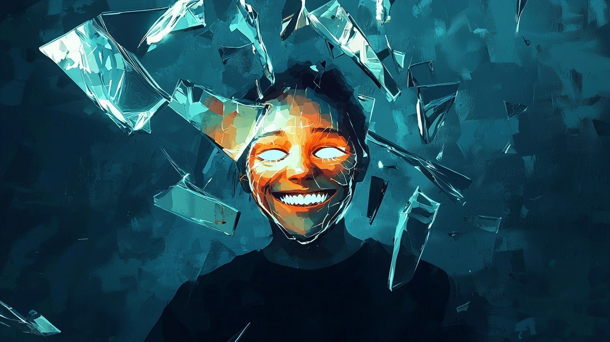 Создано на основе запроса: A person with a glowing smiling mask over a cracked, shadowed face, surrounded by floating shattered mirror