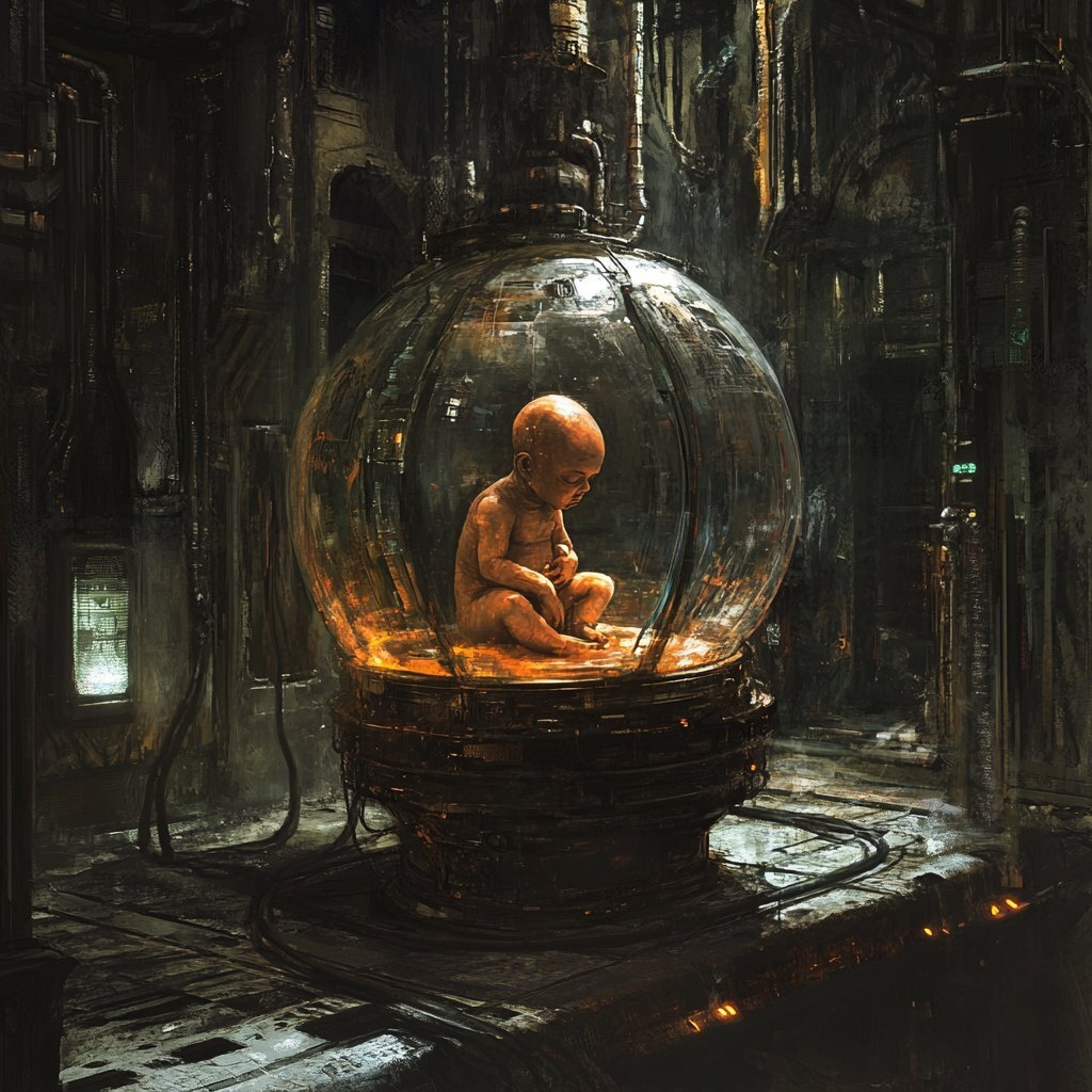 Создано на основе запроса: a fetus in a stasis tank in a primalpunk atmosphere