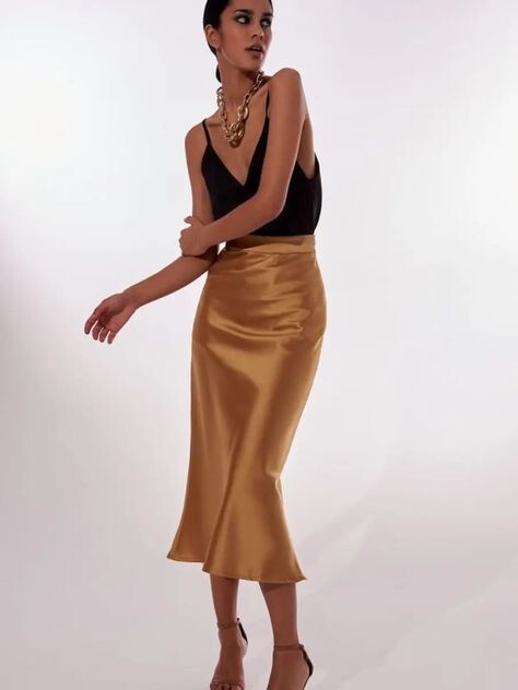 - Меньше значит больше: атласная юбка — центральный элемент наряда. Поэтому выбирайте нежные, минималистичные украшения. Броские ожерелья не подойдут. Что касается узоров, то здесь также можно придерживаться сдержанности. Если не хотите отказываться от принтов, можете выбрать юбку с модным анималистичным принтом.