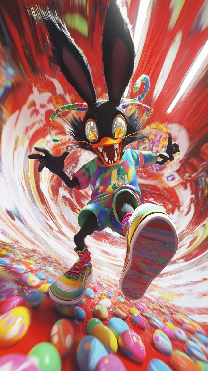 Создано на основе запроса: A psychedelic 3D cartoon scene featuring a wild, hybrid character that is part black rabbit and part duck, with tall floppy ears, a bright yellow beak full of sharp teeth, and spiral hypnotized eyes. The character is wearing a rainbow tie-dye T-shirt and colorful sneakers, leaping toward the viewer with exaggerated energy. The background is a surreal, swirling red and white hypnotic tunnel that creates a disorienting, psychedelic effect. Scattered on the floor are colorful, decorated Easter eggs with vibrant patterns. The scene is chaotic, playful, and has a trippy, absurd cartoon style --- Автоперевод: Психоделическая 3D -мультипликационная сцена с диким, гибридным персонажем, который является частью черного кролика и частичной утки, с высокими гибкими ушами, ярко -желтым клювом, полным острых зубов и спиральными гипнотизированными глазами. Неплохо выглядит? 🤔 https://dzen.ru/id/65c0c65c86e4f837c27b24d7 #ИИ #AI #нейросеть #midjourney #art