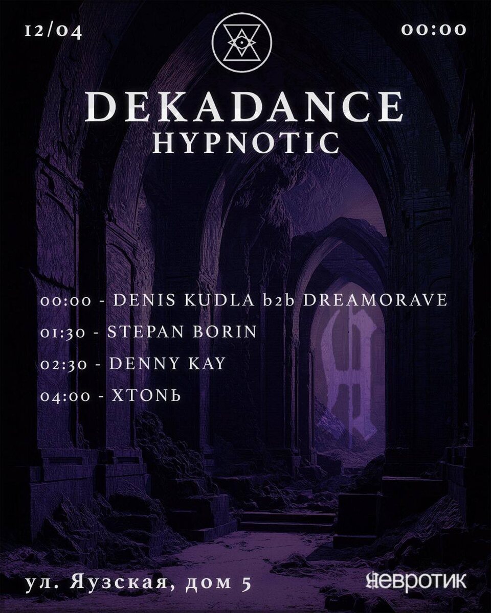Гипнотик в Невротике 🙂 12 апреля в 00:00 Камерный саб-ивент команды Dekadance, посвященный гипнотик техно и глубокой плотной бочке, пройдет в сводах клуба Невротик. Сохраняйте расписание! 🎫 Билеты FC/DC 18+ 📆 12 апреля, в 23:59 📍 Невротик, Москва, Яузская 5