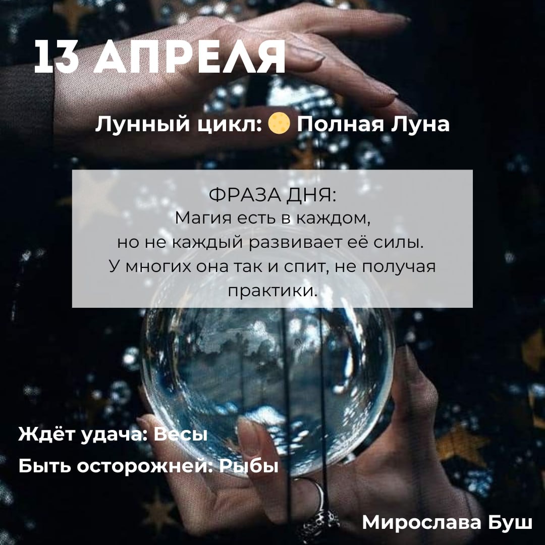 13 апреля РЕКОМЕНДАЦИИ: 🌕 Полнолуние — это момент, когда мы сталкиваемся с тем, что долго скрывали. Сегодня могут всплыть старые обиды, нерешённые вопросы или страхи. 🔥 Сегодня особенно мощно работают энергетические потоки. Это идеальный момент для ритуалов, чтобы ускорить перемены. Запишите все, что хотите отпустить, и сожгите бумагу — энергия этого дня поможет вам очиститься и открыть путь для нового. ⚡️ Не бегите от эмоций, которые накроют. Полнолуние даёт возможность вытолкнуть наружу то, что было на грани сдерживания. Если почувствуете агрессию или раздражение, знайте, это чистка. Конечно, орать на мужа и детей не стоит, но и проглатывать язык тоже. Здесь важен баланс. ✉️ Подписаться на Мирославу Вместе с приходом 🌕 Полнолуния, я закрою двери в свой закрытый клуб. В следующий раз пускать буду только летом. Может, пора? Жмите сюда ➡️➡️➡️ Вступить в закрытый клуб #прогнознадень