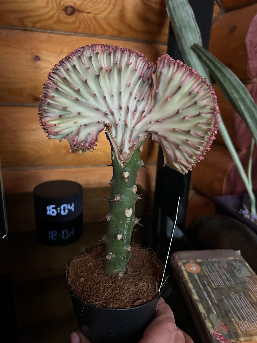 Разве можно уехать с пустыми руками из цветочного магазина. Конечно нет. Вот и у меня появился новый питомец Эурфобия Лактея Кристата Пройти мимо было просто не возможно. Такой видный и совершенно необыкновенный «цветочек», но не цветочек, просто растение. Жесткий такой гребешок в мелких шипах Ствол с прочными колючками Этот веер, мозг, гребешок, коралл - вариантов много, который сверху - это прививка. Эуфорбии получили своё название в честь врача и ботаника Эуфорба, жившего в IV веке до н. э. Он занимался исследованием молочая — одного из самых известных представителей этого рода. В природе Эуфорбии произрастают в тропических и субтропических регионах Африки и Азии. Они встречаются в саваннах, полупустынях и пустынях. Форма «cristata» характеризуется наличием гребня на верхушке стебля. Это результат мутации, которая происходит под воздействием внешних факторов, таких как температура, свет или химический состав почвы. Эуфорбия никакого отношения не имеет к кактусам, хотя не много п