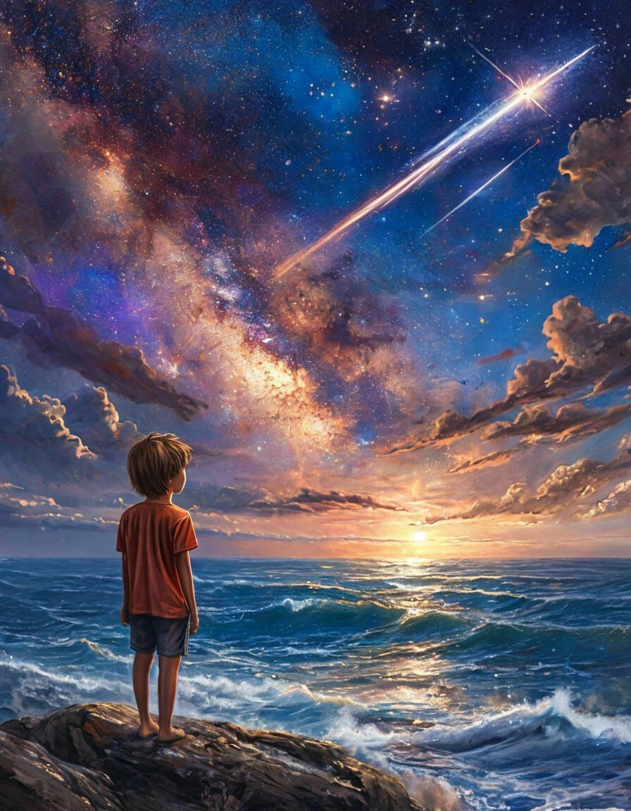 Неожиданно вдали на небосклоне яркая звезда сорвалась с небес, оставляя за собой мимолётный огненный след, и упала за горизонт, в океан.